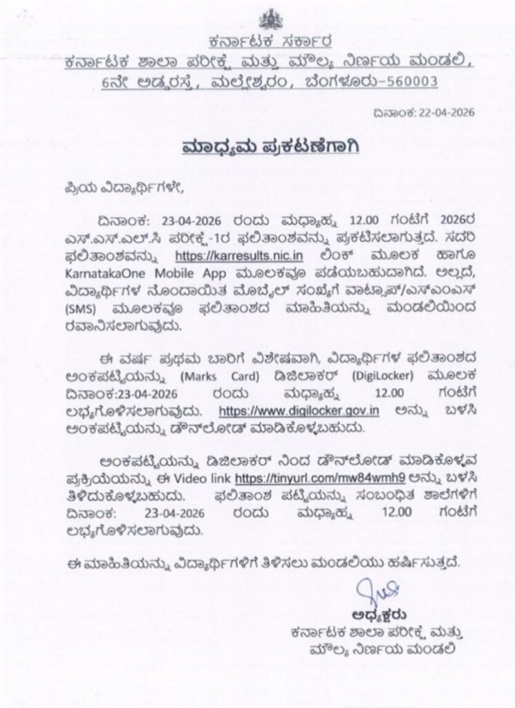 23 ಏಪ್ರಿಲ್ 2026 ಮಧ್ಯಾಹ್ನ 12:00 ಗಂಟೆಗೆ ಬಿಡುಗಡೆ ಬಿಡುಗಡೆಯಾದ ಫಲಿತಾಂಶವನ್ನು ಪರಿಶೀಲಿಸಲು ನೋಂದಣಿ ಸಂಖ್ಯೆ / ರೋಲ್ ಸಂಖ್ಯೆ ಅಗತ್ಯವಿದೆ.